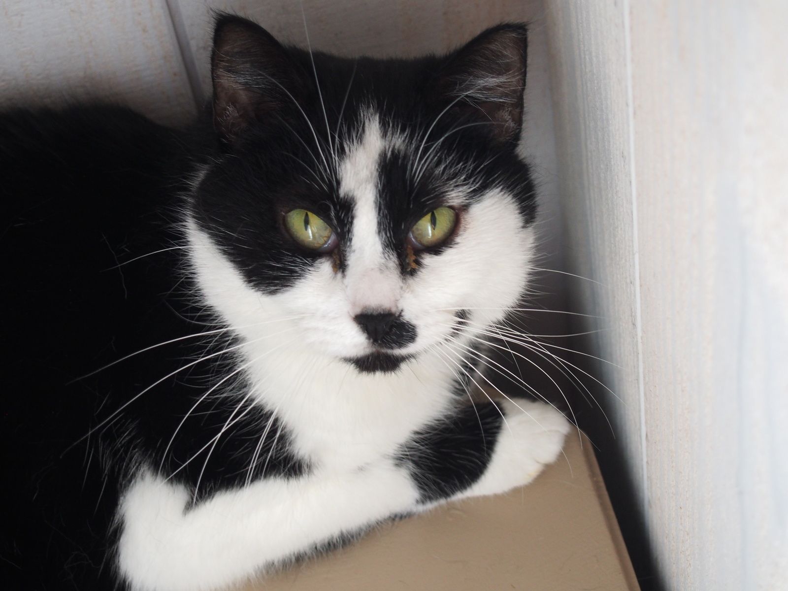 Pacifia, chat femelle noire et blanche de 2018, à l'adoption