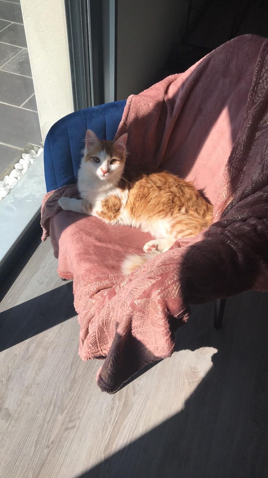 Caramel est très affectueux. Il profite de cette période de confinement pour s’amuser avec les filles dans le journée et dormir sur nos jambes dans la soirée.