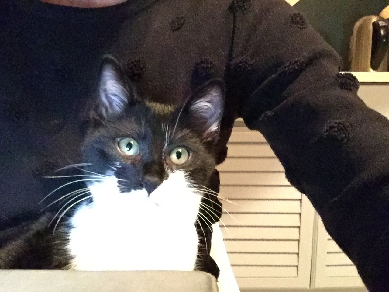 Petite chatte tres craintive et sauvage à son arrivée , elle est devenue en 2 mois une boule d'amour avec des gros câlins interminables .